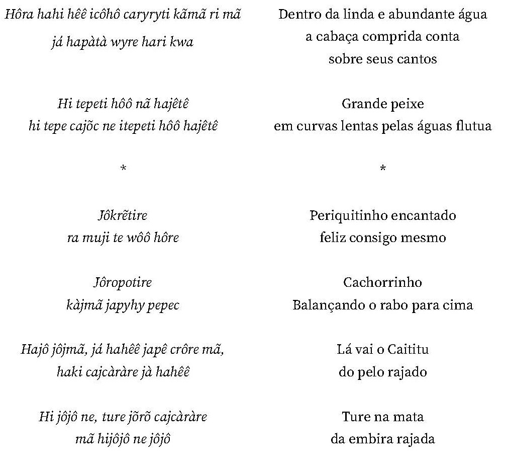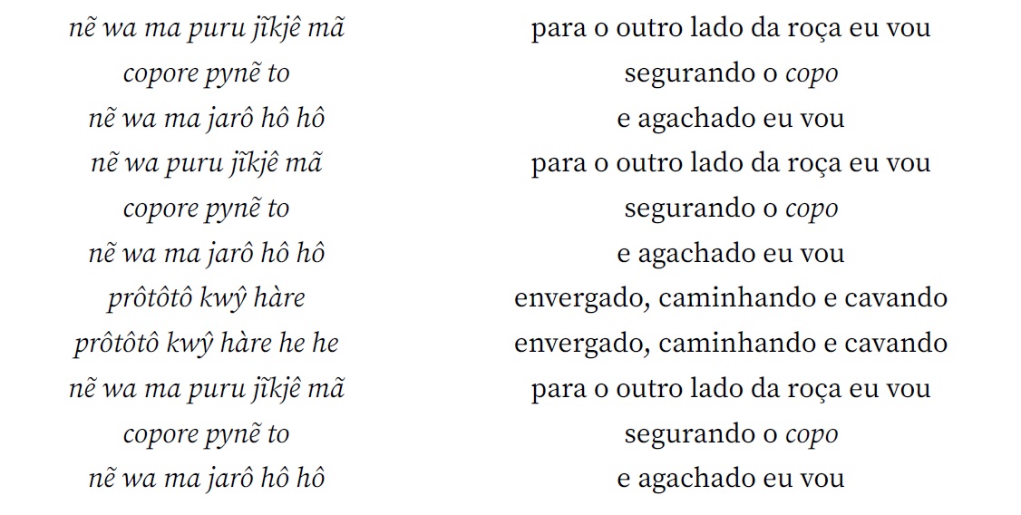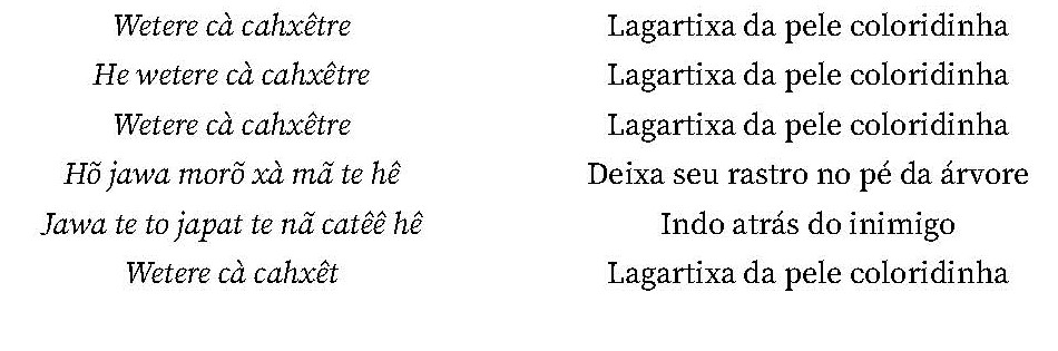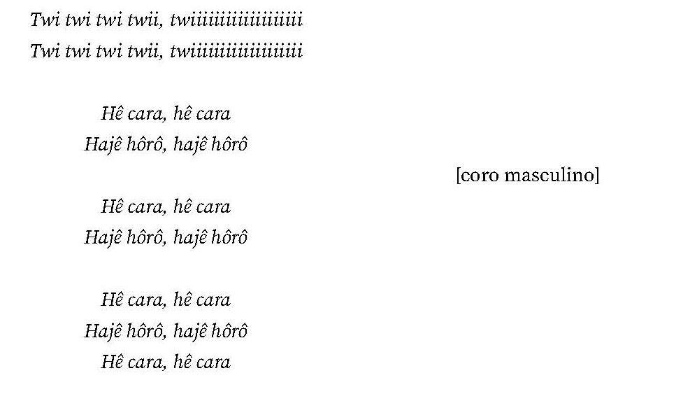 Por uma questão de espaço, optamos aqui por excluir dessa versão a repetição exaustiva dos versos e estrofes com algumas pequenas variações nas sílabas, na palavra ou na frase. Contudo, não podemos deixar de ressaltar a centralidade do fenômeno do paralelismo, amplamente analisado no contexto das artes verbais ameríndias. Entre os Krahô, outros atores também já notaram esta questão, mostrando tratar-se de um importante procedimento poético e intencional (Melatti, 1978, p. 15). Cabe notar que esse gênero de cantos rituais é marcado por sua concisão semântica, pelas transformações fonológicas sofridas pela palavra ritual, pelo uso intensivo de onomatopeias e vocalizes, metáforas e duplos sentidos, assim como pela dinâmica entre repetição e variação.