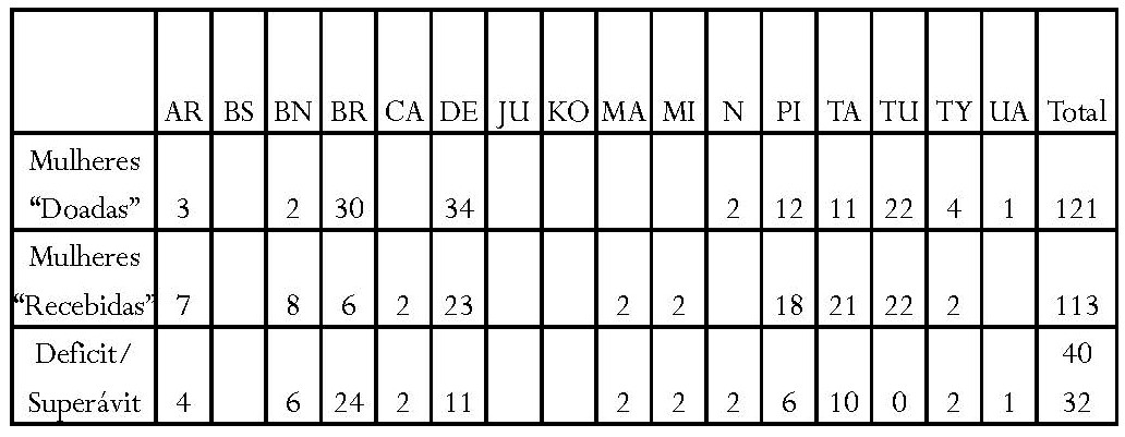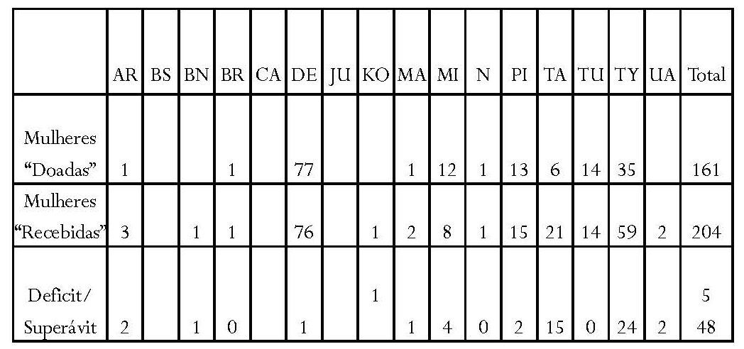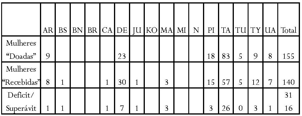 Ainda assim, é notável que as alianças nas regiões do Uaupés/Tiquié tendam a ser mais simétricas entre grupos trocadores, visivelmente para o caso tukano-desana. Em outros casos, o desequilíbrio no rating parece ser mais evidente, com alternâncias entre grupos trocadores que parecem explicar parcialmente um mecanismo compensatório. Uma segunda questão é se as trocas de tipo incestuoso podem ou não implicar assimetria, tanto em relação à quantidade de trocadores, quanto a sua posição na hierarquia; porém, esta é uma questão que ficará aberta, em função da falta de dados etnográficos para discuti-la. Outro elemento do “desequilíbrio aparente” pode ser explicado pelo deslocamento, que é um ponto que desenvolverei aqui, a partir de informações qualitativas, mas que, obviamente, necessita ainda de uma estatística confiável, pois a estatística acima não pega certos ciclos, que reportam a trocas indiretas que dificilmente são detectáveis.