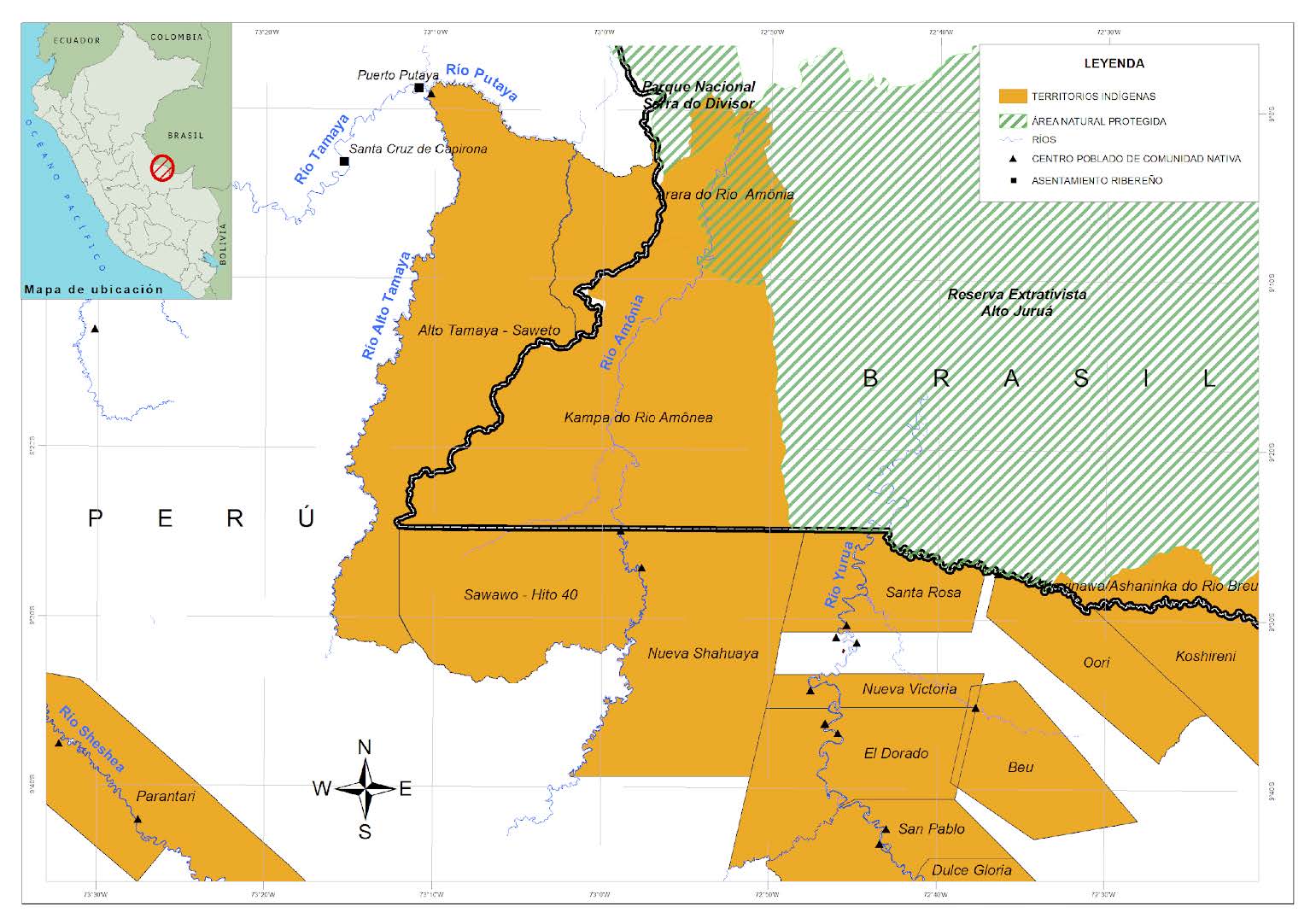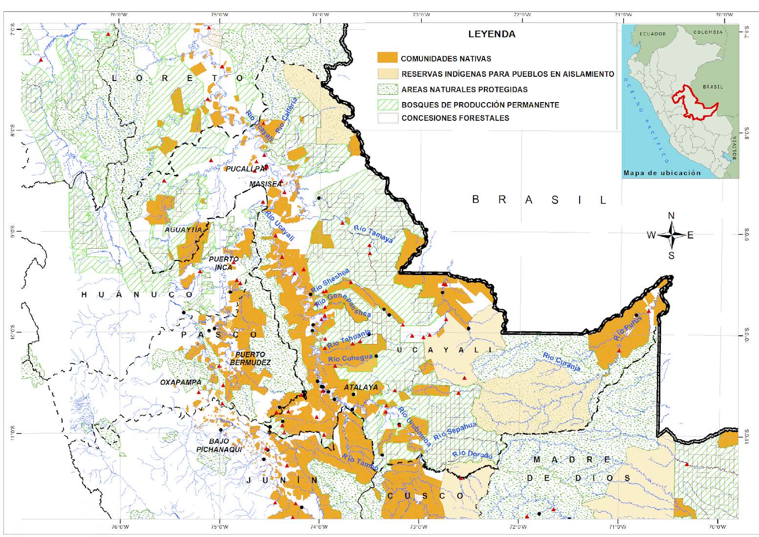 La Amazonía peruana se extiende hacia el flanco oriental de los Andes y se estima que abarca cerca del 50% del territorio peruano. Con una menor densidad poblacional, ha sido históricamente una frontera de expansión desde las ciudades de la Costa y los Andes desde la época colonial. El departamento de Ucayali, en la Amazonía central del Perú, abarca una amplia extensión de bosques tropicales, en el tránsito de la Amazonía pre-andina a la llanura amazónica, en la selva baja del Perú. Es atravesado por el río Ucayali que continúa su curso hacia el norte en el departamento de Loreto en donde se une con el río Marañón para formar el río Amazonas. El departamento de Ucayali presenta un mosaico de áreas con diferente grado de intervención, con la zona de mayor concentración poblacional y de expansión agropecuaria alrededor de Pucallpa, su capital. Su territorio se extiende al este hasta llegar al límite fronterizo con Brasil en el Estado de Acre. Las comunidades nativas se distribuyen principalmente a ambos márgenes del río Ucayali y en la zona fronteriza con Brasil y están rodeadas por unidades territoriales que el Estado ha creado con diferentes fines: reservas territoriales para indígenas en aislamiento voluntario y contacto inicial,[6] áreas naturales protegidas (ANP), bosques de producción permanente (BPP) (destinados a la explotación de madera en concesiones forestales) y lotes para la explotación de hidrocarburos (Mapa 2).