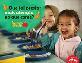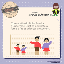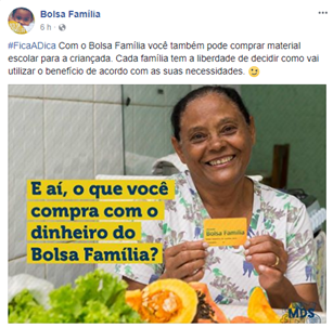 A imagem acima integra material de divulgação do Programa Bolsa Família na rede social Facebook, em que a indicação da hashtag #FicaADica orienta para a compra de material escolar e são apresentadas ilustrações de frutas, legumes e verduras, alimentos usualmente classificados como saudáveis. Ao atentar para as imagens na rede, pode-se perceber a recorrência de postagens que orientam para o consumo de alimentos, material escolar e roupas, com foco especialmente na criança. É o que se pode notar na Figura 2, em que são apresentados gastos relativos com recursos do PBF em 2008 – destaque à alimentação como principal gasto, seguida por material escolar –; no slogan “Bolsa Família é comida na mesa das crianças” (Figura 3); no recado do reajuste do valor com a imagem de mãe e filhos comprando alimentos (Figura 4); no chamamento para “prestar mais atenção no que come” (Figura 5) ou, ainda, a supermãe elástica, que com o auxílio do PBF “combate a fome e faz as crianças crescerem” (Figura 6).