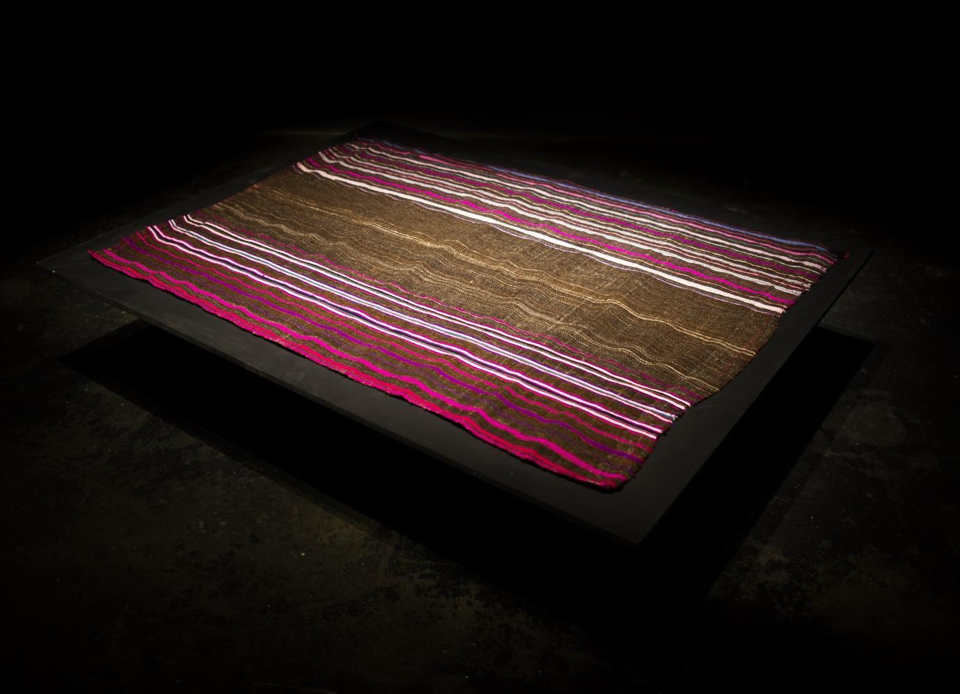 Julieth: Si, claro. Una de mis obras, las del tejido con mi abuela se llama “Recuperar la Tierra para Recuperarlo Todo ”. Consciente y completamente sensible a lo que significa la combinación de colores y esa necesidad que ella tenía de heredarme ese conocimiento del tejido. Sólo hasta ese momento creo que las dos comprendimos esa necesidad. Porque en un inicio siempre fue una imposición, un miedo inculcado de “tienes que usarlo porque si no te va ir muy mal en la vida, te van a pegar, te van a golpear, vas a conseguir un esposo que te va maltratar toda la vida ”. Estaba muy pequeña para comprender la dimensión del conocimiento sobre el tejido y hasta el momento en que realizamos esa modificación o reinterpretación del tejido es que empiezo a abrirme a la experiencia del caminar con ella, de buscar la lana. Porque hoy en día es difícil conseguirla en el territorio, mucha gente se ha ido a la ciudad a trabajar y muy pocas mujeres se han quedado aquí en el territorio con el conocimiento del hilar, del tener el animal para poder extraer la lana. Ver todas esas dificultades me hizo ser más consciente de la responsabilidad de nosotros los jóvenes, de esta nueva generación. Tuvimos que buscar una tejedora, eso nos costó mucho tiempo. Y ver el interés de mi abuela y su curiosidad por ver el resultado de este tejido, me llenó de mucha nostalgia porque vi que a ella hubiera querido hacer este tejido, pero no pudo por su estado de salud. Ese recorrido me llenó de mucha sensibilidad. Pude comprender el valor que tenía el tejido ya que en este se debía colocar unas líneas de color que están en las faldas de las mujeres, que son los anacos. Estas dos líneas de color representan su árbol genealógico. Así podemos reconocer la familia, el apellido y el lugar al que pertenece; una lectura visual a partir de las combinaciones de color. Así que cuando mi abuela le entregó esa tarea a la tejedora, le pidió que fuera nuestra línea azul con blanco, la de nuestra familia, la que encabezada el tejido. El hecho de que ella le haya dicho estas palabras a la tejedora me ayudó a comprender la dimensión tan grande que trataba de heredarnos, ese conocimiento. Y es el momento en el que yo pienso que el recorrido por las artes, el haber salido del territorio, de haber vivido una experiencia tan inestable, es una manera de recuperación. Una forma de recuperarme a mí como mujer dentro del territorio, para este territorio. Entonces hago alusión completamente a esa lucha de un pueblo, pero que también es una lucha que tenemos que empezar nosotros, como individuos, como jóvenes. Entonces, definitivamente la historia que carga esta comunidad motiva mucho mi trabajo plástico.