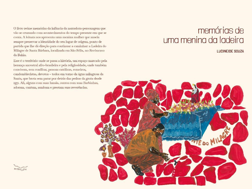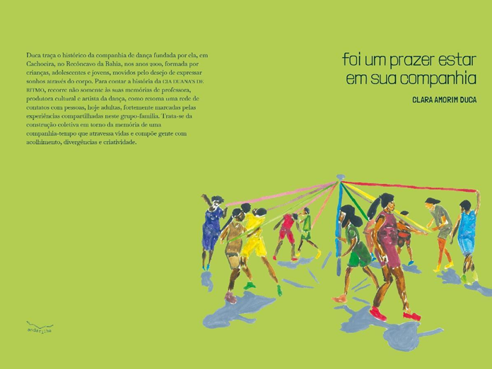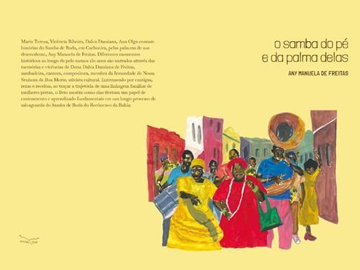 As autoras da Coleção Cachoeiras contam uma história territorial e uma geo-grafia muito distinta da história oficial do Recôncavo da Bahia. Junto com as pessoas que fizeram parte da CIA DUANA’S, Clara Amorim Duca relata o cenário de cultura e dança em Cachoeira nos últimos 20 anos (Foi um prazer estar em sua companhia, 2023). Por meio de personagens históricos de sua família e da cidade de São Félix, Lucineide Souza traz contos da Ladeira do Milagre e da Gruta de Santa Bárbara que misturam as lembranças encantadas de uma menina e os confrontos religiosos entre católicos e candomblecistas (Memórias de uma menina da ladeira, 2023). A luta pela patrimonialização, transmissão e preservação do samba de roda como bem imaterial ganha vida através da história do surgimento do Samba de Roda de Dona Dalva e sua relação com a trajetória de mulheres negras do Recôncavo nas palavras de sua neta, Any Manuela Freitas (O samba do pé e da palma delas, 2023). É também essa luta do samba de roda que inspira a arte de Maine Jesus para a ilustração da capa amarela de Any Manuela.