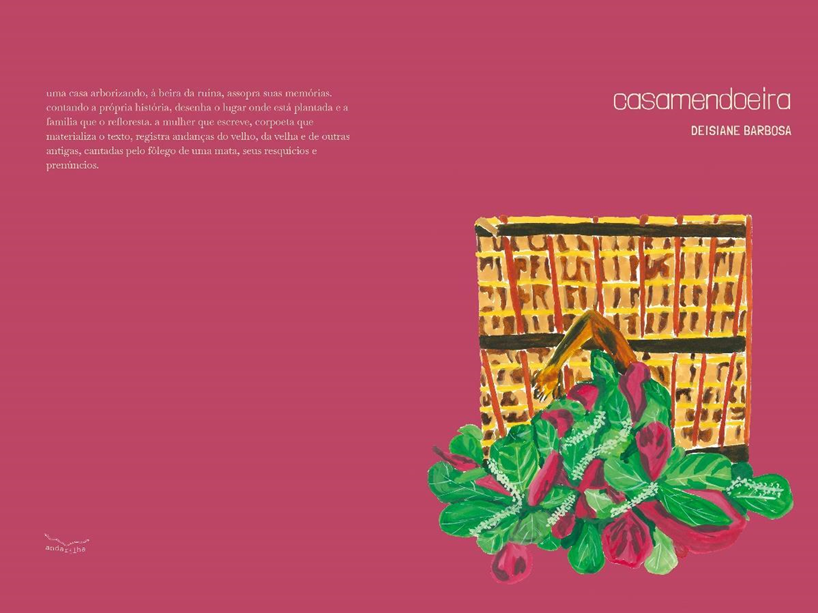 A capa do próprio livro de Deisiane Barbosa (2023), casamendoeira, também veio de uma fotografia sua. A imagem da saia rodada de folhas de amendoeira tem o telhado da casa, que é sede da andarilha edições, como fundo. Casa e amendoeira narram a história da construção de moradas de adobe da família de Deisiane na zona rural de Conceição da Feira.