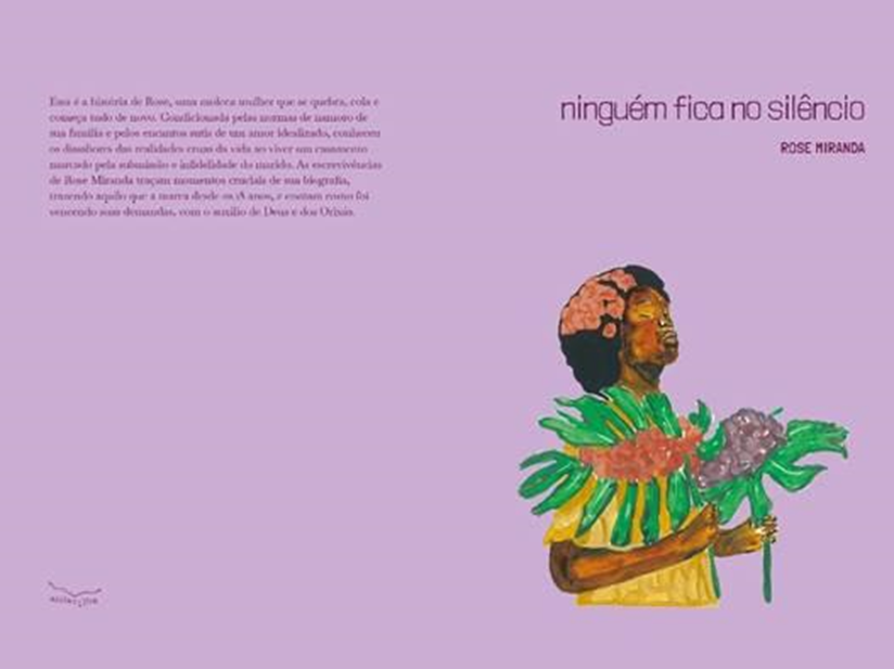 Já Deisiane Barbosa dá voz narrativa a duas personagens principais: a amendoeira e a casa de adobe construídas-plantadas pelo seu avô, que contam as histórias de uma família que habita um recôncavo-casa de farinha, pouco mencionado pela literatura que fala do Rio Paraguaçu e do porto que conectava a capital, Salvador, ao sertão baiano (casamendoeira, 2023). Por fim, Rose Miranda se distancia de vez de uma narrativa heroica e masculina para rememorar o caminho de uma mulher com fome de conhecimento que enfrentou um casamento que não lhe permitia abrir as asas (Ninguém fica no silêncio, 2023). E com sua doçura, fez ver em palavras a menina carregando folhas e flores desenhada por Maine Jesus.