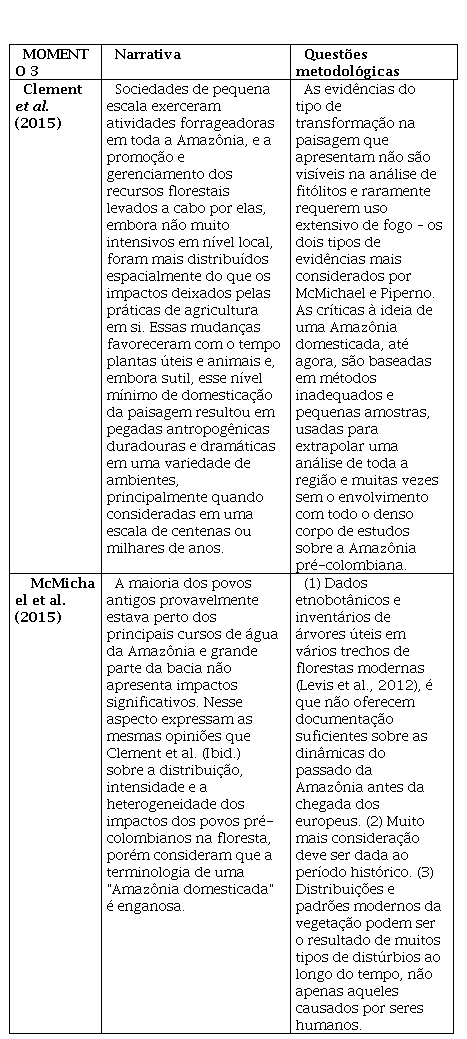 No Momento 3, é possível perceber, de modo marcado, as duas narrativas propostas. Uma vez tornadas claras as diferentes posições sobre a variação do grau de impacto, conforme a hipótese intermediária de Bush e Silman (2007), o debate se encaminha para a discussão de questões referentes às metodologias utilizadas e sobre o que um ou outro grupo de cientistas entende por “floresta domesticada“ e “floresta natural“, segundo a interpretação que dão às evidências que apontam. A narrativa da Domesticação da Amazônia proposta por Clement et al. (2015a) parece ir em uma direção ao mesmo tempo difícil de ser demonstrada e contestada, movendo o esforço metodológico para a busca de evidências cada vez mais sutis de perceber, e propondo uma interpretação baseada em um conceito de domesticação bastante amplo, remetendo às ideias colocadas por Darwin (1859) e, posteriormente, por David Rindos (1984). Por outro lado, os argumentos dos opositores da ideia de uma Amazônia domesticada permanecem quase os mesmos desde o primeiro Momento, propondo uma narrativa de certa maneira oposta, também valendo-se de extrapolações e aproveitando o estado de liminaridade que o conceito de domesticação ocupa no debate.
