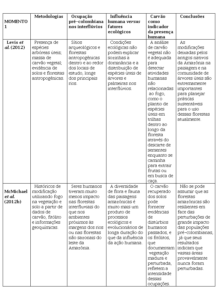 No Momento 1, observamos que Levis et al. (2012) reconhecem que seus dados apoiam a hipótese de McMichael et al. (2012) e as expectativas de Bush e Silman (2007) de que a intervenção humana na paisagem diminui com a distância dos rios principais e secundários, porém, afirmam que a extensão do impacto das populações humanas do passado nas áreas de interflúvio, observada no estudo que fizeram, parece ser superior ao esperado por aqueles que advogam por uma influência efêmera e localizada nessas áreas. Da mesma forma, Levis et al. argumentam que, embora as condições ecológicas possam explicar a dominância de algumas espécies de árvores sem invocar a necessidade de dispersão pela ação humana, especialmente de algumas espécies de palmeiras, seus resultados apontam que o efeito da distância em relação aos rios foi mais forte provavelmente devido ao manejo humano no passado (Levis et al. 2012, 7).