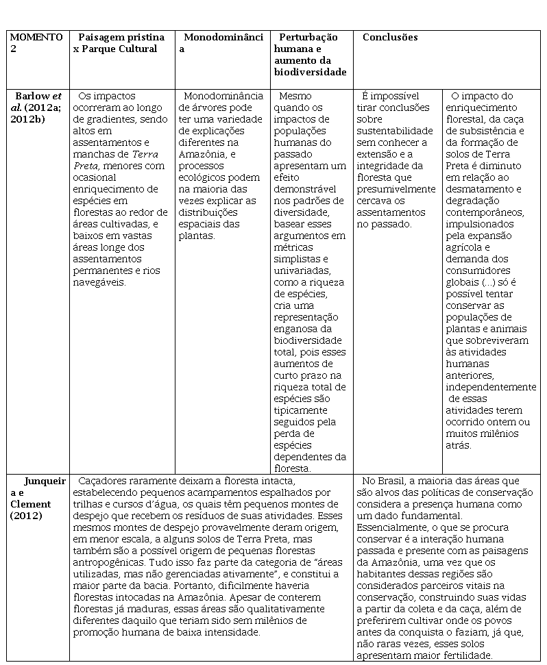 Concomitantemente a isso, outro grupo de cientistas, ecólogos experientes, recomenda maior atenção aos modelos clássicos da Ecologia e parcimônia nas interpretações dos dados. No Momento 2, Barlow et al. (2012a, 46), por exemplo, concordam que as populações indígenas do passado plantaram algumas espécies, deliberadamente ou não. Porém, fazem a ressalva de que a monodominância de árvores pode ter uma variedade de explicações diferentes na Amazônia, e processos ecológicos podem, na maioria das vezes, explicar as distribuições espaciais das plantas).