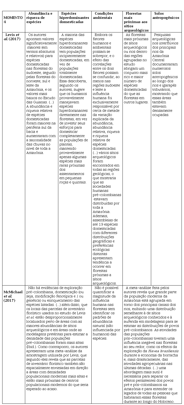 A discussão vai tornando-se, assim, carregada de ambiguidades, como fica claro no Momento 4. Esse momento merece uma atenção especial, pois cada assertiva, praticamente, vem acompanhada de uma ressalva, e o argumento final destoa completamente do tom hesitante e inconclusivo do artigo como um todo. Vemos assim, por exemplo, que ao discutirem abundância e riqueza de espécies (M4-Q1), Levis et al. reconhecem que os dados disponíveis para a análise em larga escala se baseiam em parcelas florestais e sítios arqueológicos desigualmente distribuídos pela área de estudo e em interpolações de condições ambientais. Portanto, os dados usados por eles e os demais autores podem não capturar a variação real dos fatores humanos e ambientais do passado em toda a bacia (Levis et al. 2017, 930).