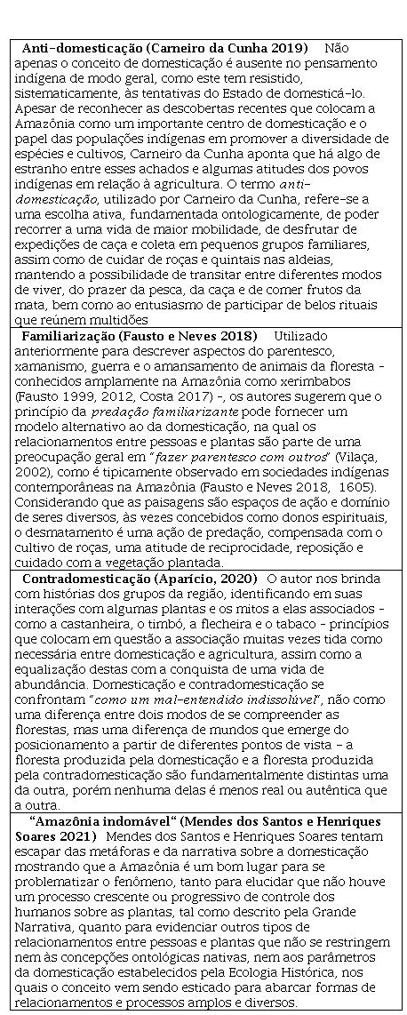 Inspirados pela problematização geral em torno do conceito na Antropologia e na Arqueologia, e atentos aos desdobramentos propostos pela Ecologia Histórica acerca do tema na Amazônia, pesquisadores com larga experiência com grupos indígenas e populações tradicionais reagiram ao debate sobre o emprego do conceito de domesticação para caracterizar a relação entre plantas e pessoas na região. A partir de um engajamento com as ontologias ameríndias e sínteses teóricas bem estabelecidas sobre os sistemas cosmológicos indígenas na Amazônia, esses autores interpelam a narrativa da Domesticação da Amazônia, propondo deslocamentos do conceito de domesticação à luz das formulações nativas a respeito das relações entre humanos e não-humanos, como pensada e vivida por diferentes grupos (Fausto e Neves 2018, Carneiro da Cunha 2019, Aparicio 2021, Mendes dos Santos e Henriques Soares 2021).