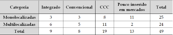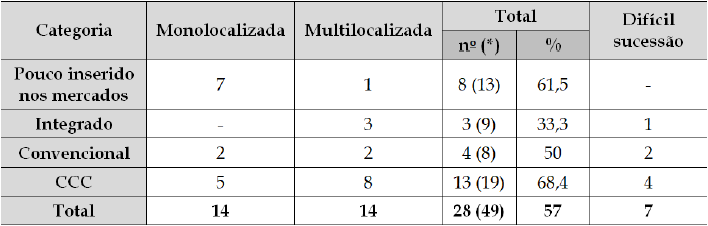 O Quadro 1, a seguir, apresenta a distribuição das famílias de agricultores entrevistadas segundo as distintas categorias da tipologia e a condição de localização dos seus membros. Pela definição de famílias multilocalizadas adotada neste estudo, os membros externos considerados na análise mantêm relações de compartilhamento de recursos com aqueles que permanecem na UAF. Na sequência, as principais características dessas categorias são analisadas.