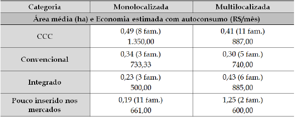 Quanto às famílias integradas, entre as monolocalizadas observa-se tanto uma área menor destinada ao autoconsumo (0,2 ha) quanto valores monetários estimados menores de economia decorrente da produção de alimentos para o consumo familiar (R$ 500,00 mensais), quando comparadas às categorias de CCC e de convencionais. Nas famílias integradas multilocalizadas percebe-se o destino de uma área para o autoconsumo um pouco maior (0,4 ha), bem como uma maior economia associada à produção para o autoconsumo (R$ 885,00 mensais).