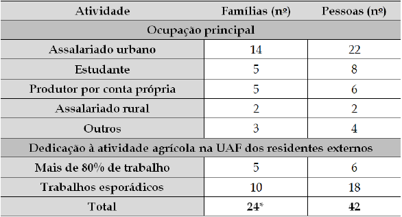 A principal característica das famílias multilocalizadas identificadas neste estudo consiste, portanto, nas transferências de alimentos da UAF para os membros familiares externos. Essa situação pode ter relação direta com o valor dos rendimentos auferidos com essas atividades externas, além do fato de a maioria dos filhos que estuda fora depender exclusivamente da renda da UAF. Conforme evidencia o Quadro 3, a condição de assalariado urbano contempla a maioria das famílias multilocalizadas e das pessoas dessas famílias que residem fora da UAF com, respectivamente, 14 famílias e 22 pessoas. No escopo deste estudo não se levantou informações a respeito do tipo de emprego e respectivas remunerações desses assalariados. Uma questão em aberto para novos estudos é se a modesta remuneração das atividades exercidas por esses membros externos explicaria, em grande parte, a inexistência de transferências de recursos financeiros para os familiares que residem e trabalham na UAF?