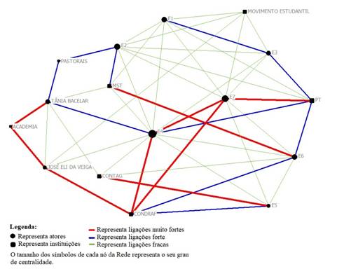 A utilização de sociogramas se configura, dessa forma, como auxiliar para a compreensão dos arranjos institucionais e relações formais e informais no processo da política. As redes criadas no contexto deste trabalho são representações gráfico-teóricas de relações (links, as relações – sociais, políticas, acadêmicas etc. – entre os nós) entre unidades (“nós”, atores e instituições) em um determinado ponto do tempo. Assim, observa-se que a conformação dessa rede é um conjunto de conexões em torno de interesses compartilhados, nos quais os objetivos são atingidos por meio de trocas materiais e imateriais (apoio financeiro, político, intelectual), o que permite visualizar como tais conexões formaram uma comunidade de política capaz de alavancar as discussões e tomar a frente de deliberações sobre a política de desenvolvimento territorial no Brasil.