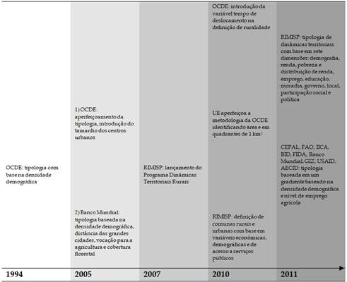 Como pode ser visualizado na Figura 1, diferentes tipologias de ruralidade tornaram-se, ao longo do tempo (especialmente a partir do início dos anos 1990), objeto de reflexão de uma série de organizações, em particular a OCDE, mas também o Banco Mundial, a Organização das Nações Unidas para a Agricultura e Alimentação (FAO) e a Comissão Econômica para a América Latina e o Caribe (CEPAL).