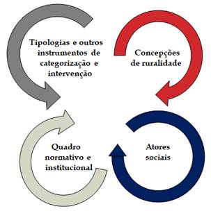 Tratava-se, portanto, de construir um novo repertório de metodologias e instrumentos de intervenção a partir das novas concepções de ruralidade em curso, que implicava numa “nova” rede de atores sociais a ser alinhavada bem como na elaboração de um quadro normativo e institucional que lastreasse e suportasse tais iniciativas. Esse complexo jogo de relações pode ser visualizado, de forma um tanto quanto esquemática, na Figura 2.