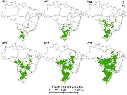 A Figura 5 apresenta a evolução da produção (em toneladas) de soja entre 1973 e 2018 no Brasil. Pode-se verificar que, especialmente a partir de 1999/2000, houve um enorme crescimento, que se concentrou em determinadas regiões do país: originalmente centrada na região Sul a produção de soja expandiu-se para os cerrados, inicialmente na região Centro-Oeste e, posteriormente, na região Nordeste. O caso do estado de Mato Grosso é bastante significativo e deixa bem claro o forte processo de concentração (econômica e fundiária) que lastreia esse “estilo” de crescimento. Podemos acrescentar que parte dessa produção e seu respectivo esmagamento passaram a ser objeto de controle de grupos estrangeiros (argentinos, americanos, chineses etc.).