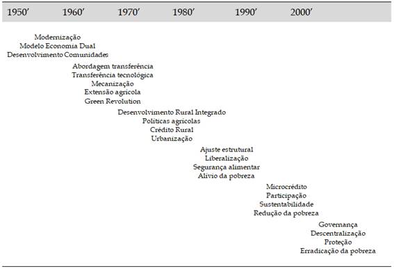 Segundo Ellis e Biggs (2001), uma perspectiva histórica de mais longo prazo sobre as ideias e referências que marcaram o debate a respeito do desenvolvimento rural, em particular na América Latina, pode ser expressa no Quadro 1, a seguir.