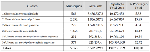 Os autores, ao revisitarem os microdados do IBGE propondo uma nova tipologia do espaço rural brasileiro, identificam seis classes de áreas, partindo daquela denominada “essencialmente rural isolada” até a “urbana em metrópoles e capitais regionais” (BITOUN et al., 2017). Pode-se verificar pelo Quadro 3 que os estratos que integram as regiões rurais contabilizam 36,92% do total da população brasileira, distribuída em 87% dos municípios, que ocupam uma área equivalente a 89,2% do território nacional.