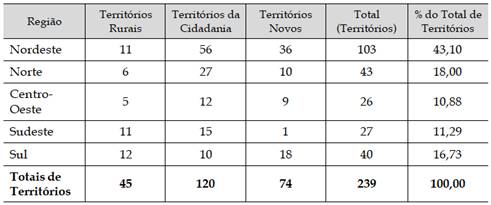 Os dois programas mais conhecidos nessa direção são o Pronat, que passou a vigorar em 2004, e o Programa Territórios da Cidadania (PTC) instituído em 2008. O Quadro 5 traz os dados sobre o total de territórios por região do país. Há um total de 239 territórios, sendo 120 do PTC, concentrados na Região Nordeste (43,1% do total). O número atualizado em 2017 pela Secretaria Especial de Agricultura Familiar e do Desenvolvimento Agrário (SEAD), vinculada à Casa Civil (depois da extinção do MDA e, consequentemente da Secretaria de Desenvolvimento Territorial – SDT, com a crise e o desmonte das políticas agrárias em 2016), é de 246 territórios (127 ligados ao PTC), sendo 42,68% deles localizados na Região Nordeste (SEAD, 2017).