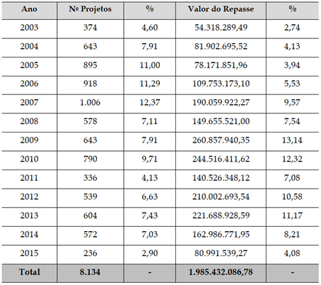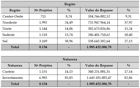 Como pode ser observado no Quadro 6, foram financiados entre 2003 e 2015 um total de 8.134 projetos de desenvolvimento territorial, chegando a quase R$ 2 bilhões correntes, o que é comparativamente pouco frente aos valores praticados com a política de crédito rural no país. Diferentemente desta última, tais recursos se concentraram (37,92%) na Região Nordeste do país (ver Quadro 7) e com forte peso também da Região Norte (15,24%), o que corrobora objetivos contidos nos programas voltados ao combate à pobreza e à promoção do desenvolvimento, especialmente por meio de investimentos em infraestruturas territoriais (82,86% dos recursos), revelando uma outra radiografia de um “rural possível” no país.