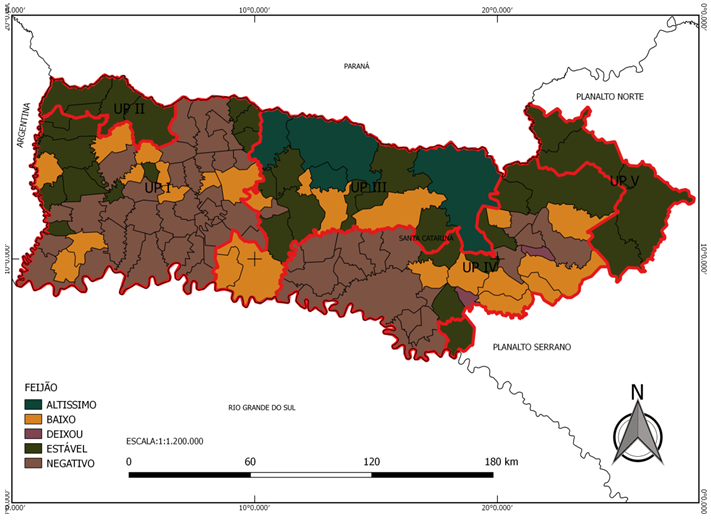 A área plantada com feijão reduziu-se em 80,43%. O feijão foi uma das culturas tradicionais da agricultura familiar na região, como fonte de receita rápida, pelo curto prazo de seu cultivo, e a possibilidade de realização de duas safras. Perdeu importância pela redução da mão de obra nas famílias e pelo processo de mecanização, que reorientou a produção para as regiões com topografia plana em que ocorre a colheita mecanizada. No mapa da Figura 9 percebe-se que apenas quatro municípios tiveram aumento da área plantada, sendo que em ampla maioria das localidades ocorreu redução da área destinada a este produto. Os municípios que apresentaram crescimento de área plantada tem topografia que favorece a mecanização e boas condições climáticas para o desenvolvimento desta cultura.
