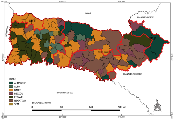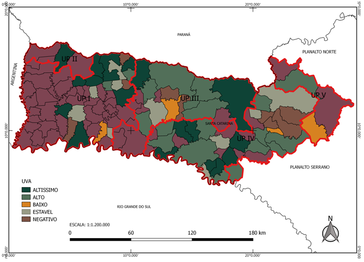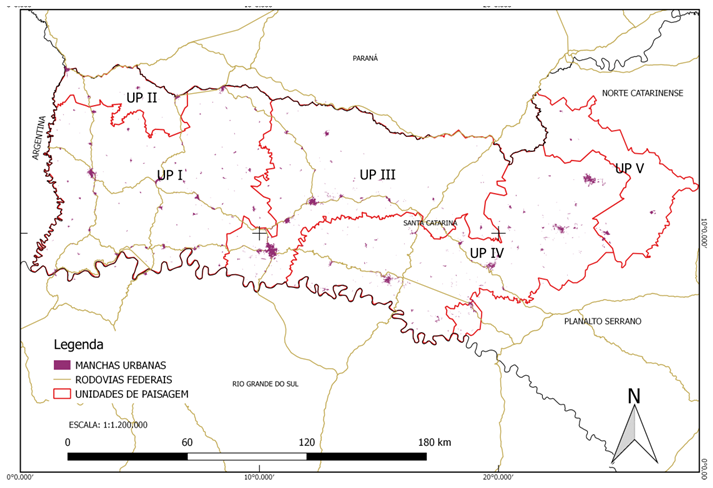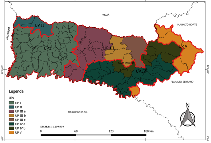 A região oeste catarinense foi caracterizada em cinco unidades de paisagem no estudo desenvolvido por Liane Welter (2006). Esta autora, na sua classificação congregando natureza e sociedade que compõem e interagem no espaço geográfico da região, percorreu o caminho de seu estudo produzindo mapas temáticos de geologia, relevo, rede hidrográfica, clima, solos, vegetação, população, uso e cobertura da terra, rede viária e divisão administrativa. As cinco unidades de paisagem receberam as seguintes denominações: Unidade I – Planalto Dissecado do Extremo-Oeste; Unidade II – Planalto de Capanema; Unidade III – Planalto de Chapecó; Unidade IV – Planalto do Vale do Rio do Peixe; Unidade V – Planalto de Campos Novos. O mapa das cinco unidades e suas subunidades, modificado com o objetivo de possibilitar as divisas pelos limites dos municípios que as compõem, é apresentado na Figura 4.