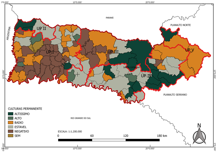 Com uma redução de 40,9% da área ocupada, as culturas permanentes reduziram ainda mais a importância na produção agropecuária da região. A maior queda de produção foi da laranja, 77,84%, principalmente na Unidade I. O cultivo de maçã, com uma redução de 53,9% e 49,42%, respectivamente, concentra-se nas Unidades V e IV, principalmente com a diminuição de área de cultivo da maçã no município de Fraiburgo, com 63,49%, e do pêssego em Caçador, redução de 79,18%. A erva-mate também teve uma redução de área de 18,93%.