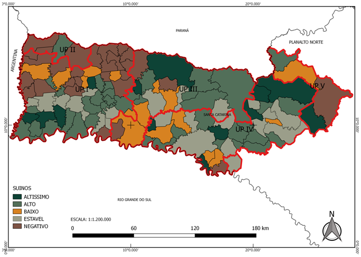 A suinocultura, atividade econômica que deu origem ao parque agroindustrial da região, teve evolução descontínua entre os municípios nas diferentes unidades. Destaca-se queda de produção na Unidade II, e norte da Unidade I, e crescimento expressivo nas Unidades IV e V. Este movimento representa mudanças para a região, onde ocorreu crescimento significativo no plantio de grãos.