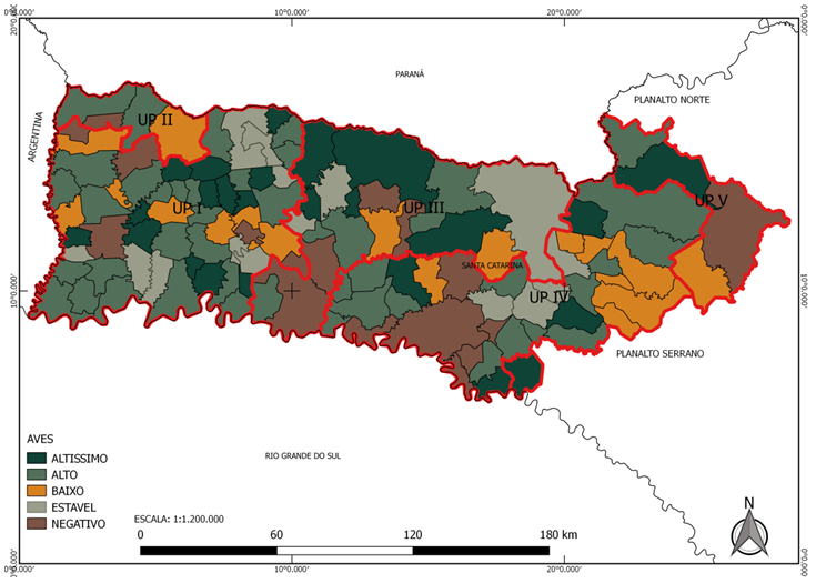 Na produção de aves esta descontinuidade entre os municípios nas diferentes unidades de paisagem é ainda maior que na suinocultura. Destaca-se a queda de produção nos municípios-sede e vizinhos dos três principais polos agroindustriais da região: Chapecó, Concórdia e Videira.