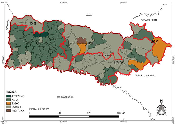 A produção de gado de corte tem crescido nas unidades mais ao sul e decrescido e estabilizado mais ao norte da região. Isto representa uma troca significativa da produção na região. As localidades tradicionais na produção de gado estão sendo ocupadas pela produção de grãos (soja e milho), diminuindo a exploração da bovinocultura, ao passo que nas regiões tradicionais de agricultura familiar, com a perda da viabilidade da produção de grãos, há ocupação pelo gado, ou seja, é o boi indo para as encostas em que se localizavam as antigas florestas e a produção de grãos deslocando-se para os campos.