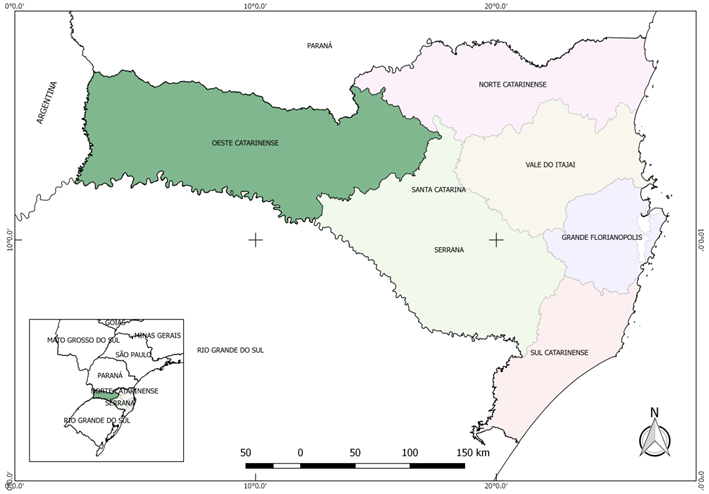 A região oeste catarinense (Figura 1) é composta por 118 municípios, reunidos em cinco microrregiões, ocupando uma área de 27.310,24 Km², e fazendo divisa a oeste com a Argentina, ao sul com o estado do Rio Grande do Sul, ao norte com o estado do Paraná e a leste com as regiões serrana e norte catarinense.
