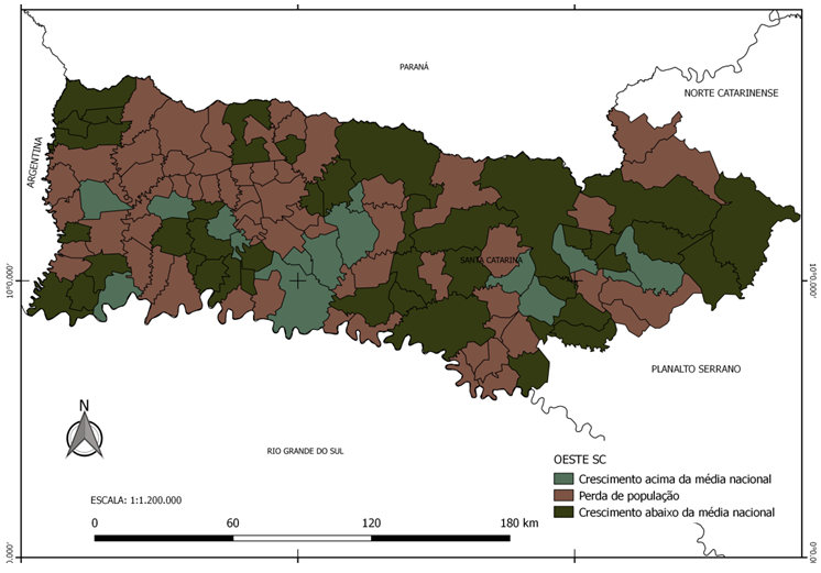 Os movimentos migratórios são uma marca da região, que inicialmente teve seu crescimento populacional devido à chegada dos imigrantes do sul. Esgotada a disponibilidade de terras, dois movimentos se intensificaram: a) a migração para novas fronteiras agrícolas no estado do Paraná, região centro-oeste, norte e, recentemente, para o nordeste brasileiro; b) migração do campo para as cidades da região e para grandes cidades em outras regiões do país. Este movimento, inicialmente realizado pelos caboclos,3 se intensificou, posteriormente, com a saída da juventude (MATTEI; ALVES, 2006). Na Figura 2 pode-se observar esta realidade de mudança populacional durante a primeira década do atual século.