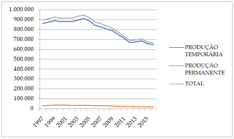 A produção permanente sempre teve uma importância relativamente pequena perante a área total destinada à produção agrícola. Como podemos observar no gráfico da Figura 5, nestes últimos 20 anos, a participação relativa da produção permanente diminuiu de 3,42% em 1997 para 2,89% em 2016.