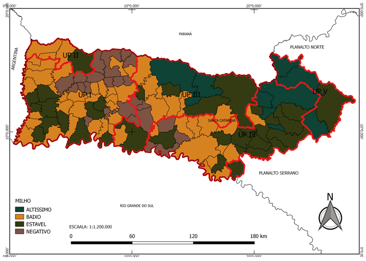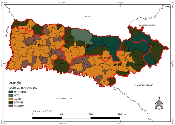 A área destinada à produção agrícola temporária tem decrescido ao longo dos anos na região, com diminuição desigual entre as unidades de paisagem. As pertencentes às Unidades I e IV são as que têm maior redução de área, pois o relevo mais acidentado destas áreas, a base física, impõe limites à mecanização, levando à redução da área cultivada. Por outra parte, relaciona-se ao fato dos dados da Produção Agrícola Municipal do IBGE não contabilizar as áreas utilizadas com a produção de milho para silagem, crescente nestas unidades, atingindo em 2016 um total de 164.475 hectares nesta produção (EPAGRI.CEPA, 2017, p. 20). As unidades que exibem crescimento estão localizadas ao norte, nas unidades V e III B e C, municípios estes situados em locais onde a vegetação original era de Campos ou Floresta Ombrófila Mista.