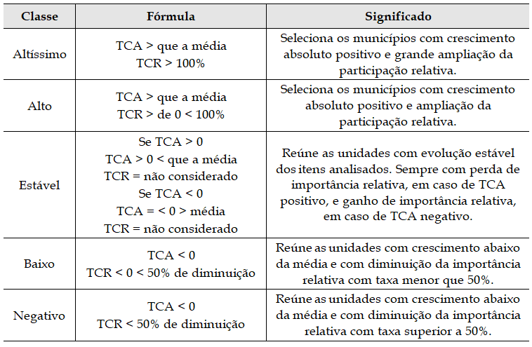 Para a elaboração dos mapas, seguiram-se os seguintes passos: 1) cálculo das Taxas de Crescimento Absoluto – TCA da área plantada ou do número de animais, para cada um dos itens estudados. Para diminuir a influência de fatores sazonais, as taxas foram calculadas considerando-se as médias dos três primeiros e dos últimos três anos do período (TCA = [média dos três últimos anos/média dos três primeiros anos] X 100); 2) elaboração de quadro da participação relativa de cada item para cada ano (Participação relativa = [valor do ano da unidade/valor total do item no ano nas unidades] X 100); 3) cálculo da Taxa de Crescimento Relativo – TCR de cada unidade para o período (TCR = [média dos três últimos anos/média dos três primeiros anos] X 100); 4) classificação de cada item para cada unidade em cinco classes, de acordo com o quadro a seguir: