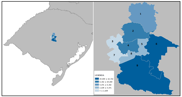 Legenda: 1: Pinhal Grande; 2: Nova Palma; 3: Ivorá; 4: Faxinal do Soturno; 5: Dona Francisca; 6: Agudo; 7: Silveira Martins; 8: São João do Polêsine; 9: Restinga Sêca.