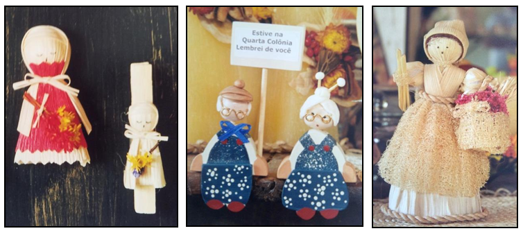 Porém, em vez de retomarem a produção dos artefatos da coleção Colônia Natal, ou até mesmo de criarem uma nova coleção de produtos vinculados à Quarta Colônia como conformação territorial, os artesãos vêm suprindo a demanda por souvenirs identitários com a inserção de uma referência textual às peças, com o nome do município de origem do artesão, precedida da frase: ‘Lembrança de’. Além disso, a maioria dos produtos comercializados como souvenirs identitários não era confeccionada com matéria-prima ou técnica que os vinculassem especificamente à Quarta Colônia. Ademais, alguns dos souvenirs artesanais encontrados durante o estudo não eram sequer fabricados no território, como uma miniatura de moinho em madeira que, apesar de apresentar uma etiqueta com o nome do município onde estava sendo comercializada, no verso do produto era possível constatar que a sua produção era proveniente da cidade de Benedito Novo, estado de Santa Catarina.