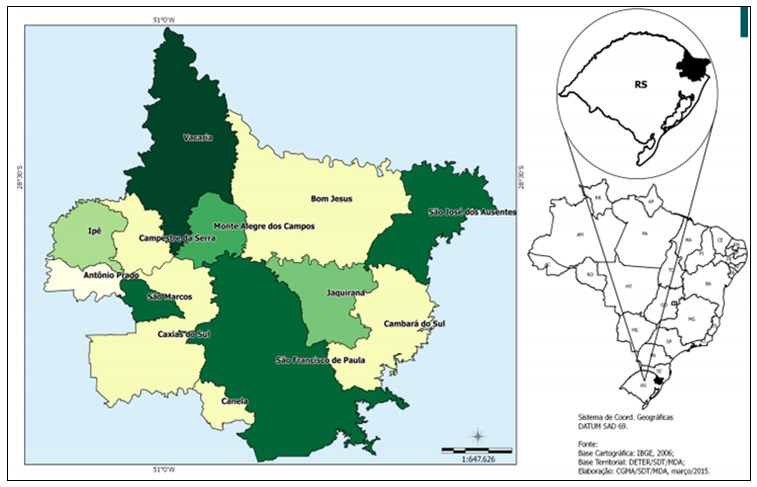 No Rio Grande do Sul existem 18 territórios (entre TRs e TCs), dentre eles está o Território Rural Campos de Cima da Serra, que foi reconhecido pelo MDA a partir da Resolução no 94 de 23 de maio de 2013 do Condraf. O território compreende uma área total de 15.501,70 Km², com uma população estimada em 627.501 pessoas, onde grande maioria da população (91,37%) é considerada urbana (FEE, 2015). É composto por 13 municípios: Antônio Prado, Bom Jesus, Cambará do Sul, Campestre da Serra, Canela, Caxias do Sul, Ipê, Jaquirana, Monte Alegre dos Campos, São Francisco de Paula, São José dos Ausentes, São Marcos e Vacaria (Figura 1).