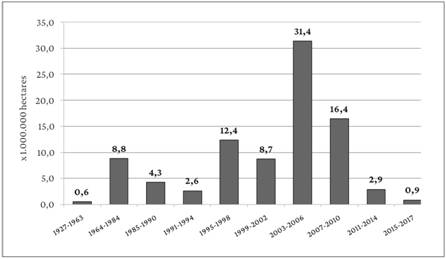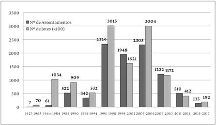 Segundo dados do Instituto Nacional de Colonização e Reforma Agrária (Incra), de 1927 a 2017, foram criados 9.385 assentamentos rurais no Brasil, com 974.545 famílias oficialmente assentadas, em uma área total de 88,4 milhões de hectares (BRASIL, 2017). Até 1964, apenas sete assentamentos foram criados, totalizando pouco mais de meio milhão de hectares e capacidade para 7.007 famílias. No início do regime militar, o então presidente marechal Castello Branco sancionou o Estatuto da Terra (Lei Federal no 4.504/1964), lei base da reforma agrária brasileira, que modernizou a antiga Lei de Terras de 1850 (Lei no 601), com dispositivos de redistribuição fundiária. Em 1970, com o Decreto-Lei no 1.110, é criado o Incra, autarquia federal vinculada ao Ministério da Agricultura, para executar as políticas públicas no setor. Porém, durante os 21 anos de ditadura militar (1964-1984), a estrutura agrária pouco se alterou: foram criados 61 assentamentos, com capacidade para 103.396 famílias, em um total de 8,8 milhões de hectares (BRASIL, 2017).