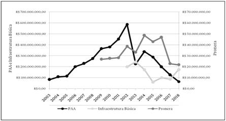 O PAA, uma das principais conquistas da agricultura familiar, que favorece diretamente a geração de renda e permanência da população no meio rural, é o programa que mais sofreu redução de orçamento, desde 2013, acumulando um corte de 90% dos recursos até 2018. O Pronera, destinado à formação educacional da população assentada, desde alfabetização até ensino superior, teve seus recursos reduzidos em aproximadamente 45%, de 2014 a 2018. Os recursos aplicados na infraestrutura básica dos assentamentos, ou seja, construção de estradas de acesso, obras de saneamento básico (água e esgoto) e eletrificação rural, foram cortados em cerca de 25% de 2013 a 2015, tendo parte dos recursos reestabelecidos nos anos seguintes, porém com aumento inferior aos cortes sofridos.