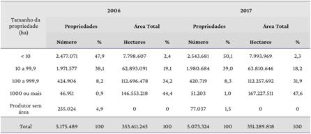 Wilkinson, Reydon e Di Sabatto (2012), ao comparar o tamanho das propriedades rurais no Brasil, entre 1975 e 2006, concluíram que a estrutura agrária brasileira é historicamente dominada pela alta concentração fundiária. Os resultados do Censo Agropecuário de 2017 reforçam essa desigualdade e indicam um aumento na concentração de terras (Tabela 1). As propriedades com 1000 ou mais hectares ocupavam 44,4% das terras destinadas à agropecuária, em 2006, passando para 47,6%, em 2017, um aumento de aproximadamente 20,6 milhões de hectares para a categoria, enquanto as pequenas propriedades, menores de 100 hectares, aumentaram menos de 200 mil hectares de suas terras.