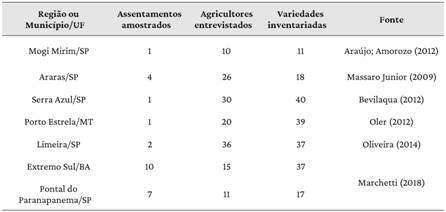Portanto, com uma orientação política marcada cada vez mais pela bússola da agroecologia e da soberania alimentar, os assentamentos rurais tornam-se terrenos férteis para estudos sobre o manejo da agrobiodiversidade. Estudos etnobotânicos sobre a diversidade de variedades locais de raízes e tubérculos, cultivadas em áreas de reforma agrária, têm demonstrado que esses espaços são importantes repositórios de diversidade agrícola, sobretudo para variedades de mandioca (Tabela 2).