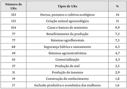 Um conjunto significativo de URs foi direcionado para atividades diretamente relacionadas à produção agrícola e extrativista e à produção de insumos, com destaque para os bancos e casas de sementes. Em cada projeto, no entanto, as URs puderam ser desenhadas de modo a propiciar diferentes tipos de arranjos e combinações, potencializando uma grande diversidade de atores e táticas e materializando-se em uma pluralidade de estratégias. Cada um dos projetos envolveu uma ação coordenada entre tipos de organizações distintos, incluindo: associações, sindicatos, cooperativas, ONGs de assessoria, empreendimentos diversos, Escolas Família Agrícola (EFAs), instituições federais de ensino, pesquisa e extensão, redes e movimentos sociais, grupos informais de agricultores e agricultoras, entre outras. Através da atuação em rede, organizações de base que dificilmente poderiam concorrer a um Edital desta natureza, puderam participar desta iniciativa e ter suas atividades financiadas.
