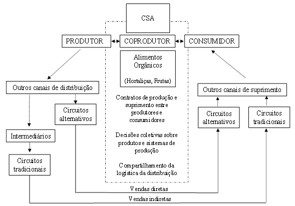 Diferente de outros formatos presentes nos circuitos alternativos de suprimento do mercado, as CSAs implicam aumento na responsabilidade e comprometimento dos consumidores para o sucesso do empreendimento social. Suas tarefas costumam incluir a logística da recepção e distribuição final dos alimentos, assim como o financiamento e o planejamento da produção e a partilha dos riscos inerentes à atividade agrícola, que podem, sob determinadas condições, limitar a oferta de gêneros. No caso das primeiras atividades apontadas, a pesquisa identificou que para 56% das CSAs respondentes, as entregas das cestas alimentares semanais competem exclusivamente aos produtores, enquanto para os restantes 44% a função é compartilhada entre produtores e consumidores. A Figura 1 mostra o enquadramento das CSAs no mercado alimentar brasileiro atual.