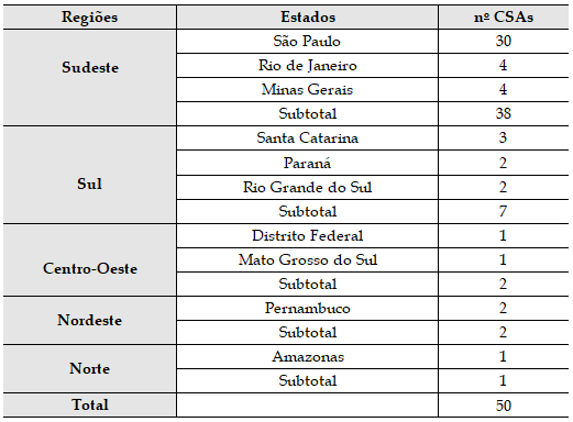 Ao estabelecer relações fora do âmbito e da lógica funcional dos mercados agroalimentares tradicionais, as CSAs possibilitam a exploração de relações comerciais relativamente autônomas entre os parceiros, já não mais baseadas nos preços e nas suas oscilações nas praças atacadistas agrícolas. Visando dar suporte organizacional, tecnológico e educacional a essas novas comunidades empreendedoras, foi criada, no país, em 2014, uma instituição sem fins lucrativos denominada Associação CSA Brasil (http://www.csabrasil.org/csa/). No início de 2017, segundo essa associação, já se contabilizavam 50 CSAs distribuídas por dez estados da federação brasileira e no Distrito Federal, conforme demonstrado no Quadro 1.