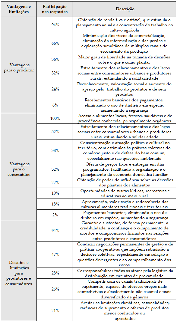 De modo geral, estudos desenvolvidos em diferentes países apontam como principais vantagens das CSAs o fortalecimento dos vínculos sociais entre agentes urbanos e rurais e a recuperação das práticas alimentares tradicionais, sob a ótica da participação política e comunitária, em prol da sustentabilidade e da proteção do meio ambiente e dos recursos naturais. Por outro lado, questionamentos são feitos sobre os limites das CSAs em aportarem efetivamente alternativas de suprimento de gêneros ao mercado, especialmente para famílias de baixa renda. No caso brasileiro, a iniciativa de implantação e desenvolvimento das CSAs apresenta-se imersa na valorização de produtos de qualidade diferenciada determinada essencialmente pelo modo orgânico de sua obtenção (WILKINSON, 2008, 2010, 2011) e pela revalorização de elementos constituintes da identidade territorial (LEFF, 2016).