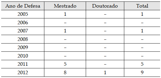Outra característica que merece destaque refere-se ao quantitativo de pesquisas sobre o tema currículo concluídas e disponibilizadas pelo do Banco de Resumos de Dissertações e Teses da Biblioteca Digital Brasileira de Teses e Dissertações (BDTD). Entre os anos de 2005-2012, foram realizadas 16 pesquisas acadêmicas. A Tabela 1 demonstra o total de produções por ano.