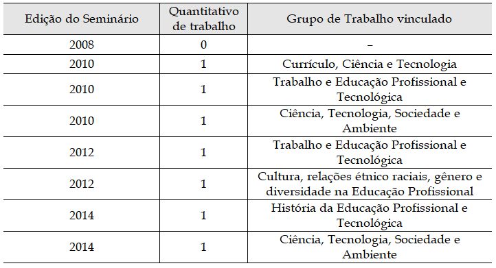 Já sobre os trabalhos em forma de artigo, apresentados nas quatro edições do Senept (2008, 2010, 2012 e 2014), foi possível identificar o total de 682 estudos distribuídos em dez Grupos de Trabalhos (GT). Nas três últimas edições do Seminário Nacional de Educação Profissional e Tecnológica, foram distribuídos entre os dez GT 560 trabalhos, entre os quais foram identificados sete trabalhos que se incluíam na temática da Educação Profissional Agrícola. Dentre estes, apenas um possuía como objeto de estudo o Currículo. Esse trabalho compôs os Anais do Evento, ocorrido em 2010, e foi inscrito no GT: Currículo, Ciência e Tecnologia. A seguir, no Quadro 1, apresenta-se, por edição do evento e por GT, a distribuição dos trabalhos que tratam da Educação Profissional Agrícola.