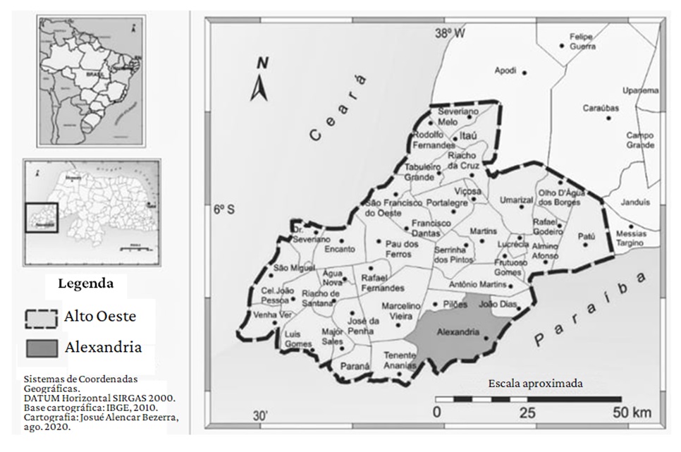 Alexandria – RN, o município pesquisado, tem uma população de 13.852 habitantes e faz limites territoriais com as cidades João Dias, Antônio Martins, Pilões, Marcelino Vieira e Tenente Ananias, todas no Rio Grande do Norte. Com o estado da Paraíba faz limites fronteiriços com Catolé do Rocha, Brejo Dos Santos, Bom Sucesso e Santa Cruz (IBGE, 2011). O município está localizado no Alto Oeste potiguar, região que faz parte do Semiárido brasileiro e conta com 30 municípios na sua composição: Água Nova, Alexandria, Almino Afonso, Antônio Martins, Coronel João Pessoa, Doutor Severiano, Encanto, Francisco Dantas, Frutuoso Gomes, João Dias, José da Penha, Lucrécia, Luís Gomes, Major Sales, Marcelino Vieira, Martins, Paraná, Pau dos Ferros, Pilões, Portalegre, Rafael Fernandes, Riacho da Cruz, Riacho de Santana, São Francisco do Oeste, São Miguel, Serrinha dos Pintos, Tabuleiro Grande, Tenente Ananias, Venha-Ver e Viçosa (Figura 1).