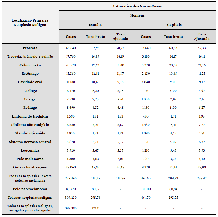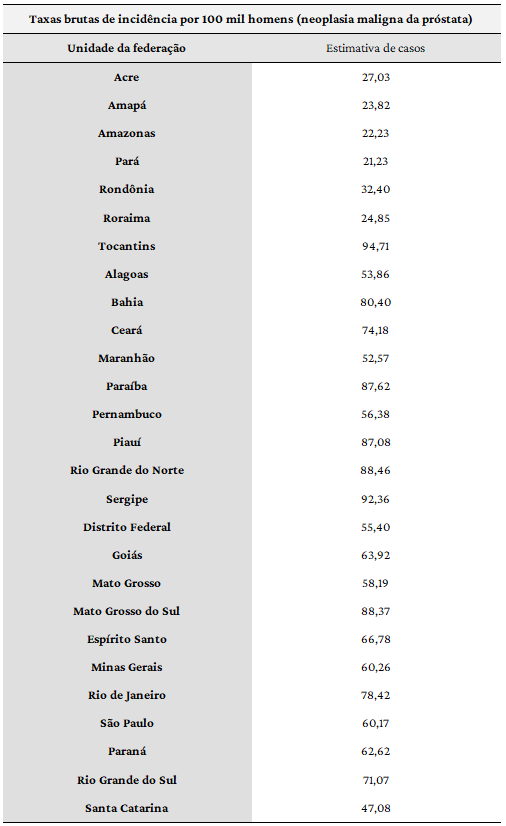 INCA – Instituto Nacional do Câncer. Neoplasia maligna da próstata. Brasília, 2020. Disponível em: https://www.inca.gov.br/estimativa/taxas-brutas/neoplasia-maligna-da-prostata. Acesso em: 3 ago. 2020.